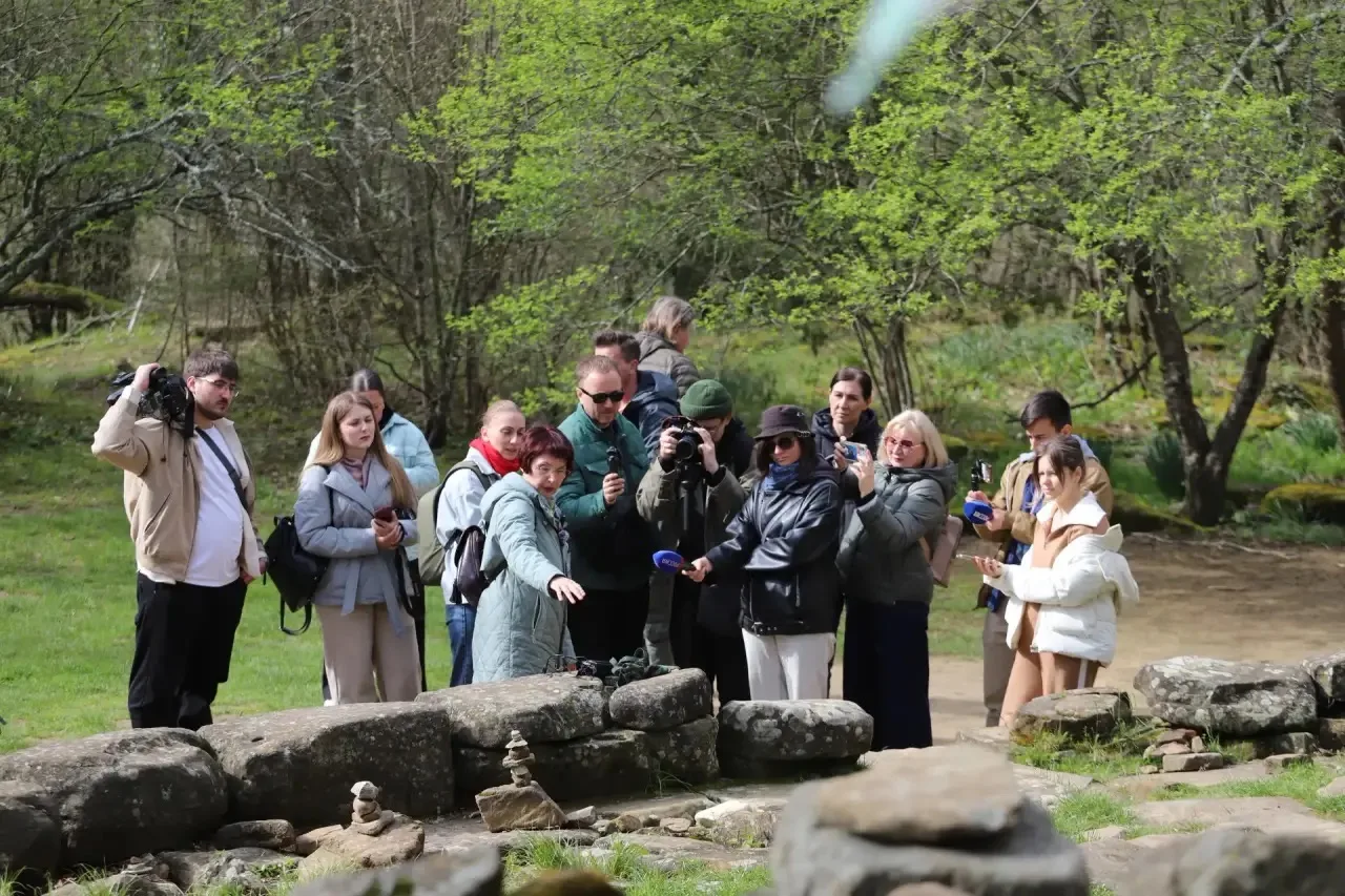 Утро началось с выезда в Дивноморский округ. Первая точка - водопады и дольмены на реке Жане. Опытный экскурсовод рассказала журналистам о тысячелетней истории этих древних сооружений. Дольмены на реке Жане уникальны: их круглые камеры сложены из прямоугольных блоков, а крыша укреплена концентрическим пазом. Нас разделяют пять тысяч лет. По мнению учёных, строителями этих сооружений были предки современных абхазов, адыгейцев и кабардинцев - народов, чья история неотделима от этой земли.