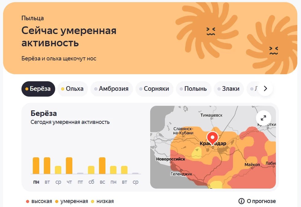 Аллергикам в городе стоит запастись антигистаминными. Держим в курсе активности пыльцы на этой неделе.