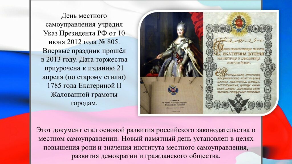 21 апреля - День местного самоуправления. Праздничная дата закреплена Указом Президента Российской Федерации от 10 июня 2012 года № 805. Поводом послужил тот факт, что 21 апреля 1785 года Екатериной II была подписана Жалованная грамота городам, положившая начало развитию российского законодательства о местном самоуправлении. Грамота на права и выгоды городам Российской Империи (так звучало полное название исторического документа) состояла из Манифеста, 16 разделов и 178 статей. При её подготовке были использованы материалы Уложенной комиссии, Цехового устава, Устава благочиния, Учреждения для управления губернией, а также образцы зарубежных документов — шведского Цехового устава и прусского Ремесленного устава. Жалованная грамота закрепила за населением городов единый сословный статус вне зависимости от профессиональных занятий.