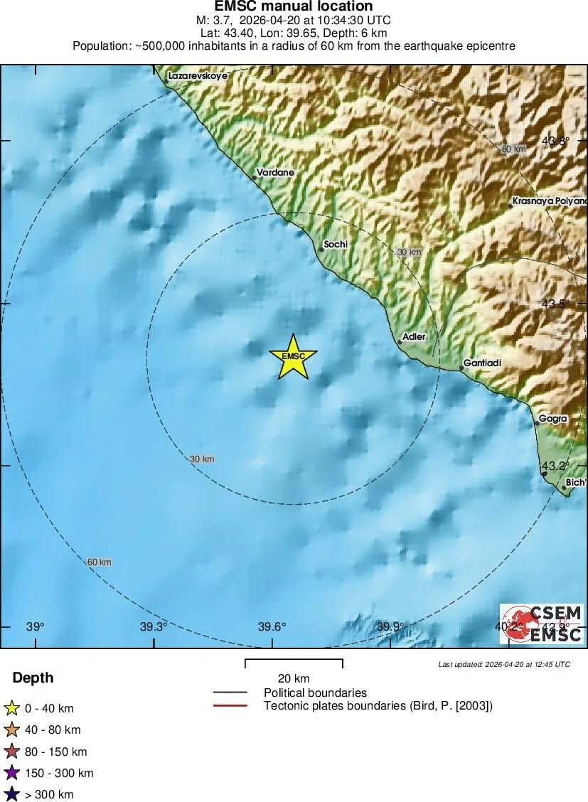 По данным Евро-Средиземноморского сейсмологического центра, эпицентр находился в 23 км к югу от Сочи и в 191 км от Краснодара. Сейсмическое событие произошло в море на глубине 7 км.