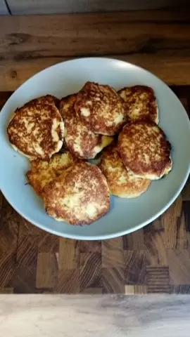 Картофель натирают на мелкой терке, отжимая лишнюю жидкость. Творог разминают до однородной консистенции. Все ингредиенты объединяют и тщательно перемешивают, затем жарят до румяной корочки. Эти оладьи отлично сочетаются со сметанным или чесночным соусом.