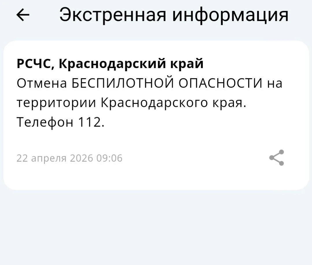 «Беспилотную опасность» отменили на Кубани спустя 12 часов.