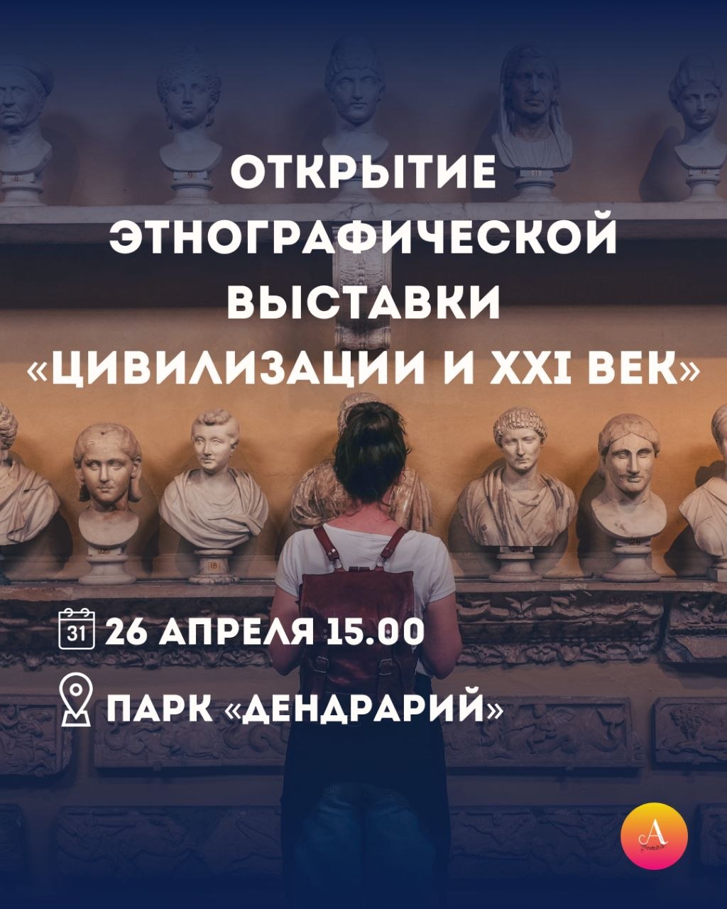 26 апреля 15.00 Открытие этнографической выставки «Цивилизации и ХХI век». Экспозиция объединит более 70 работ: живопись и предметы декоративно-прикладного искусства, отражающие связь эпох и культур. В день открытия также пройдёт лекция «Учёные о Вселенной», которую проведёт научный сотрудник МГУ.