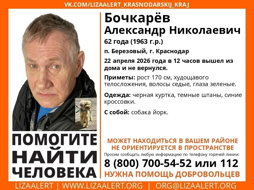 62-летний Александр Николаевич Бочкарёв 22 апреля вышел из дома в поселке Березовый, города Краснодар и не вернулся.
