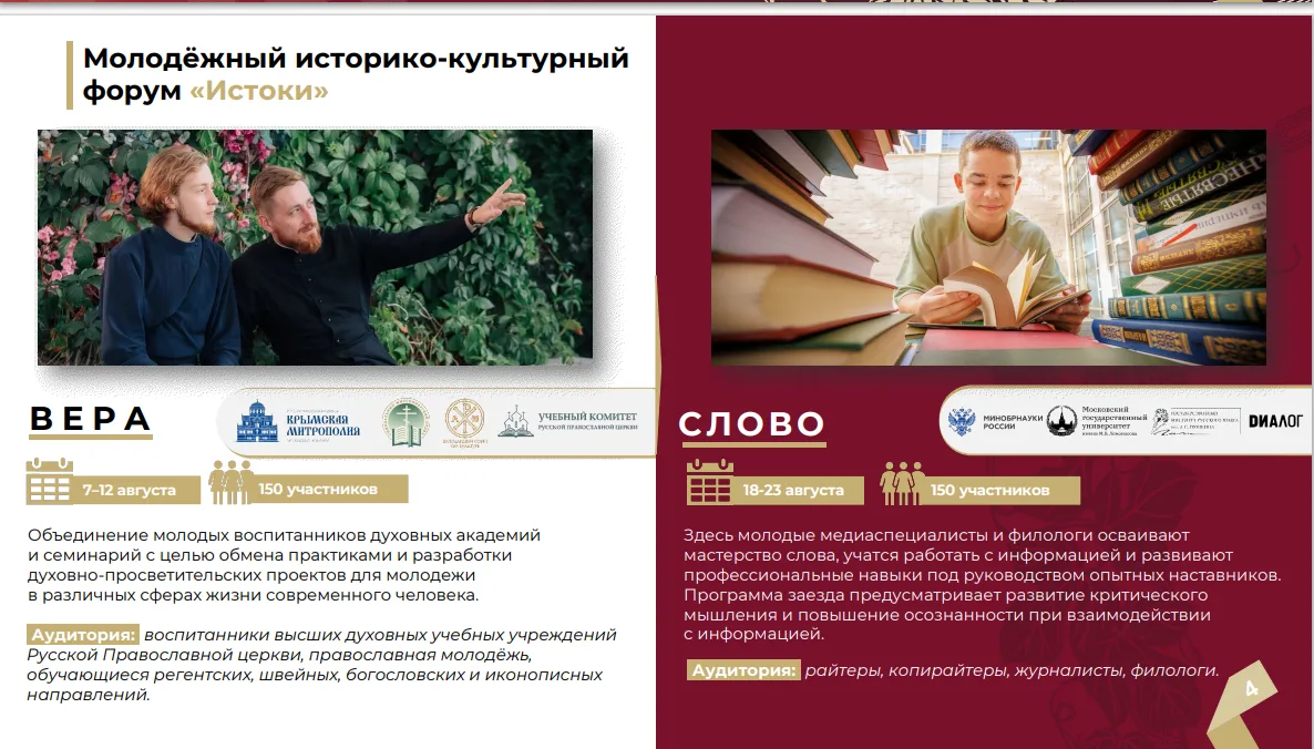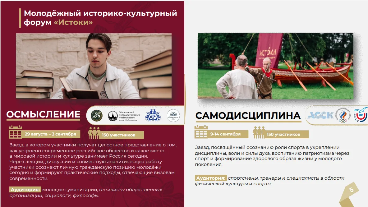 В период с 7 августа по 25 сентября 2026 г. состоятся 5 тематических заездов форума, которые объединят более 700 участников в возрасте от 14 до 35 лет.