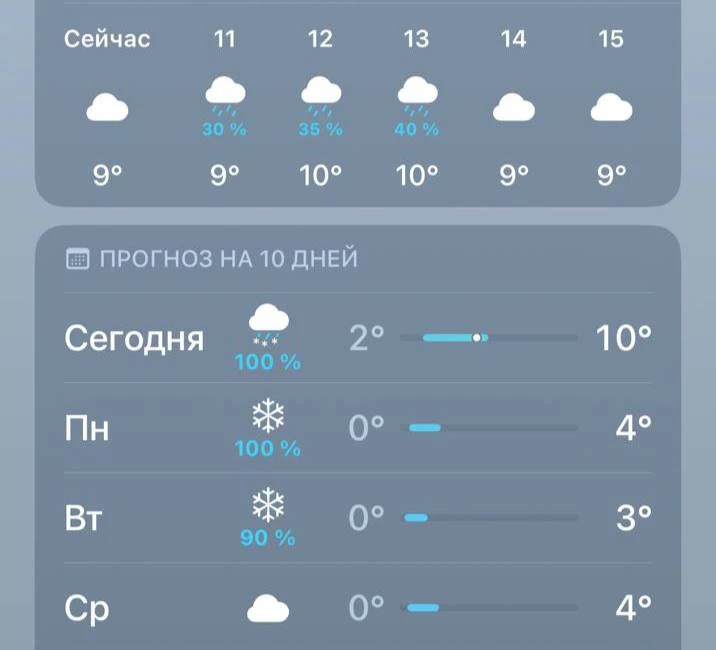 Температура — до +8…+11°, к вечеру опустится до +2…+5°. В понедельник и вторник лучше не станет: по прогнозам, в первый рабочий день ожидается снег с вероятностью 100%.
