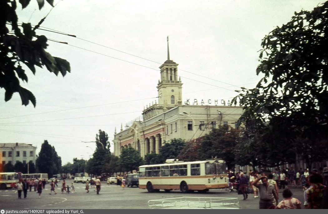Кажется, что краснодарский железнодорожный вокзал никогда не менялся. Но это не так. Менялся антураж – транспорт, люди, их одежда. Кажется, и зелени было больше, а также изменилась вывеска.