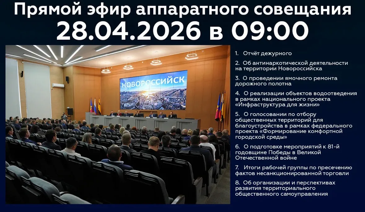 28 апреля в 09:00 начнется очередное аппаратное совещание в администрации муниципального образования город Новороссийск.