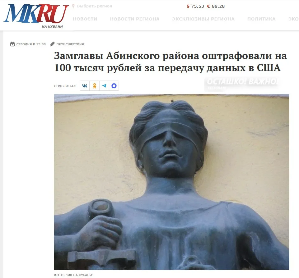 Замглавы администрации Абинского района Краснодарского края, оштрафовали на 100 тыс. за нарушение законодательства о персональных данных.