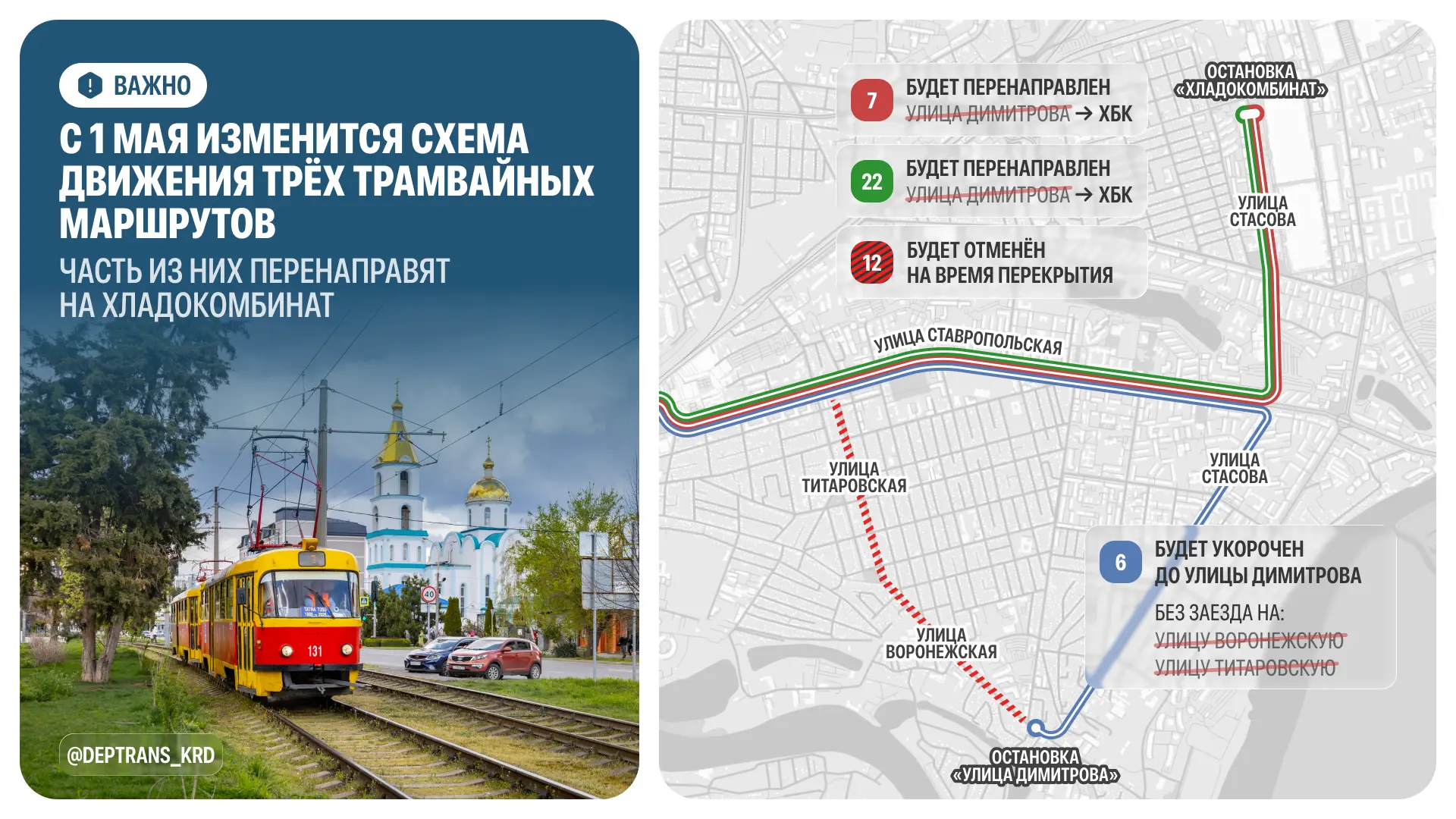 С 1 мая в Краснодаре три трамвайных маршрута изменят свою схему движения, а один будет отменён. Это нужно для аварийно-восстановительных работ на коллекторе по улице Воронежской.