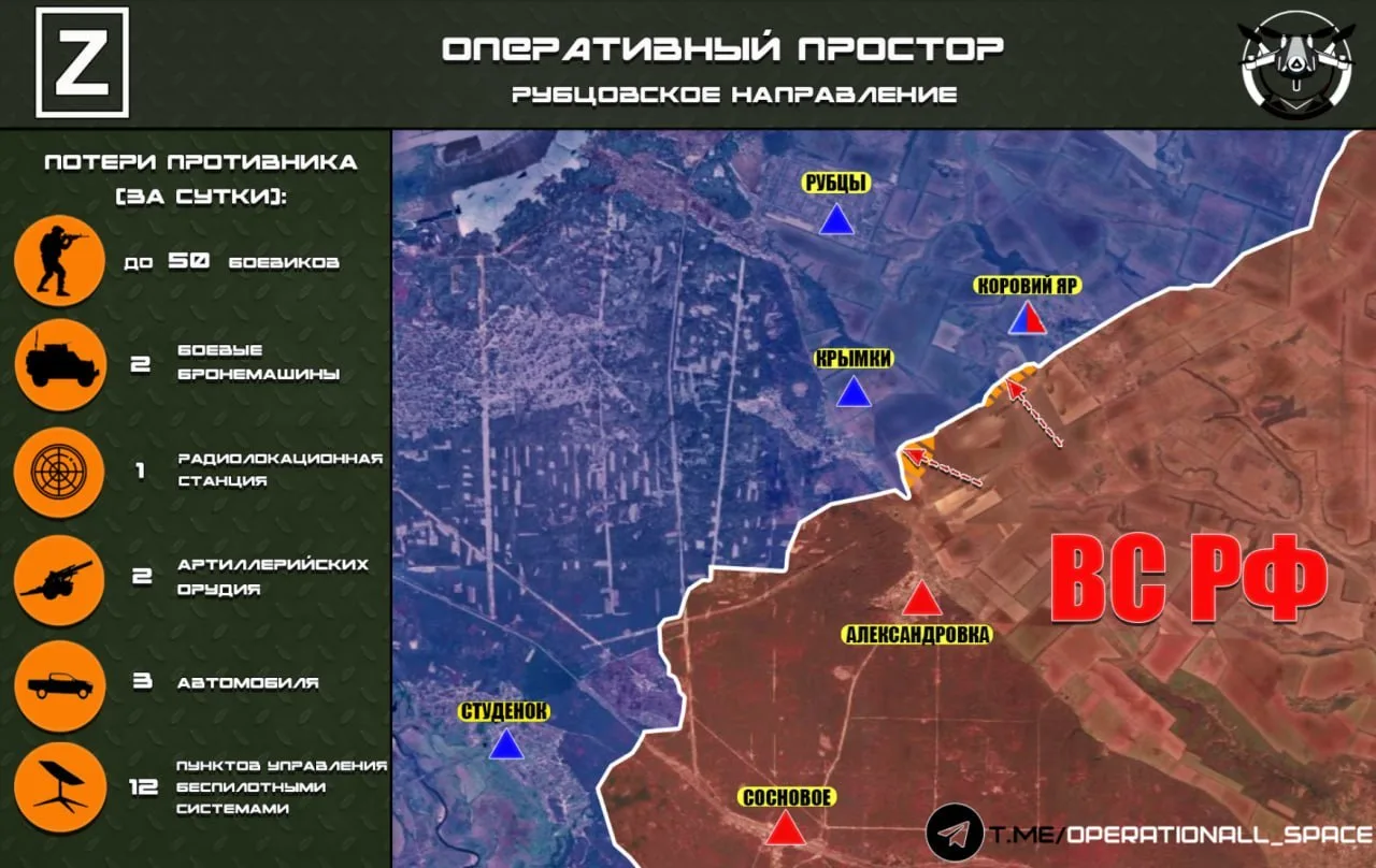 На Рубцовском направлении ВС РФ наступают в районе н.п. Крымки и н.п. Коровий Яр, сообщает "Оперативный простор":