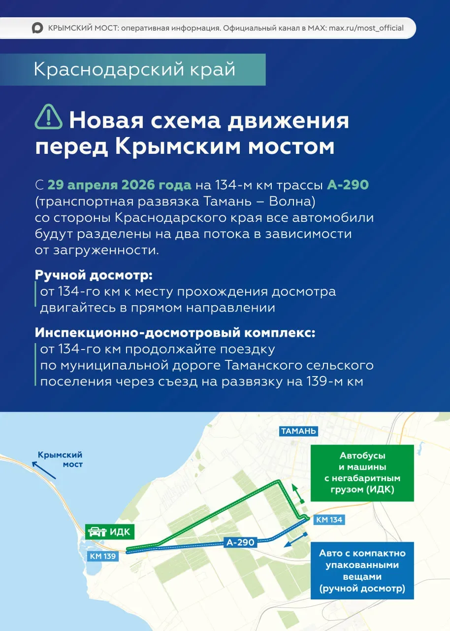 Транспорт с негабаритным грузом, а также пассажирские автобусы направят на муниципальные дороги Таманского сельского поселения через съезд на 139-м км для дальнейшего прохождения аппаратного досмотра.