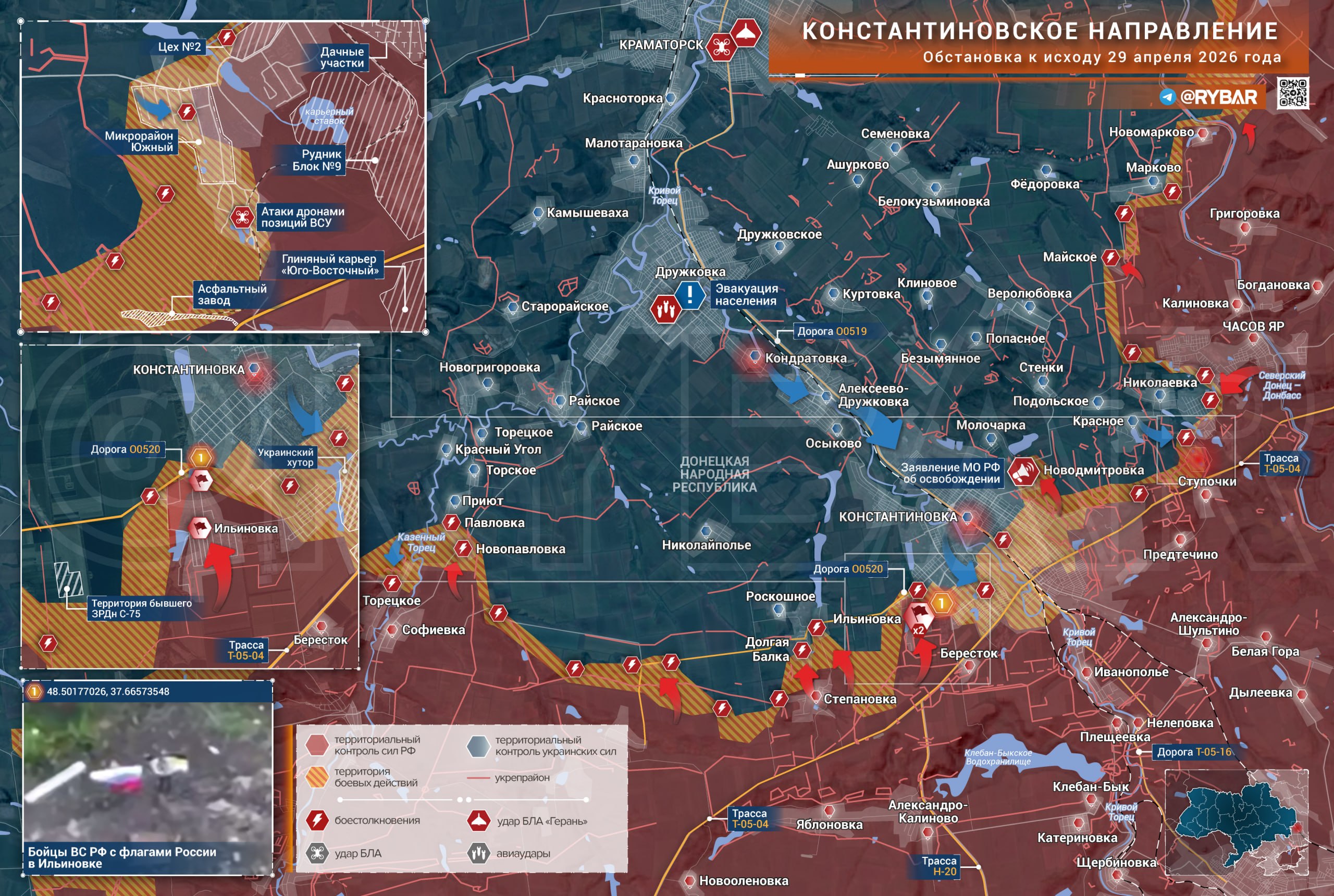 НаКонстантиновском направленииштурмовики заканчивают зачистку Ильиновки, ведут бои в центре Константиновки. Восточнее ВСУ все еще удерживают позиции на окраине Часова Яра, поступают сообщения об освобождении Новодмитровки.
