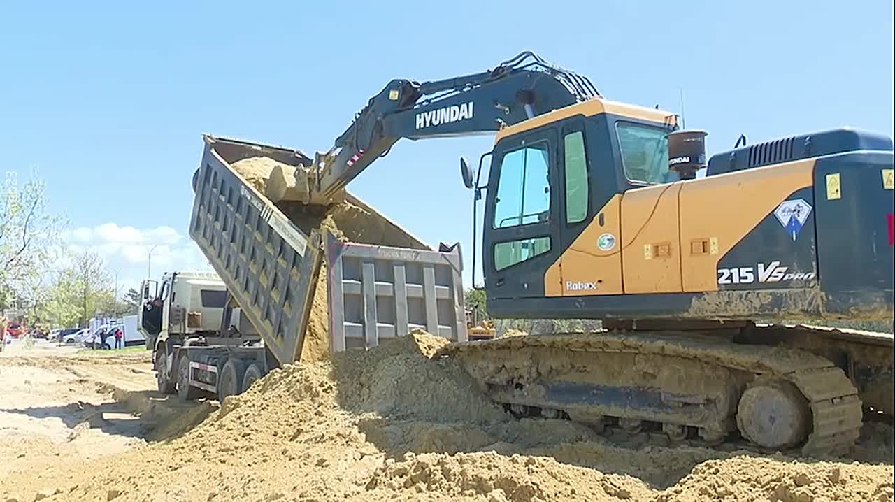 Уже спланировано 800 метров полосы, сверху уложили слой чистого песка толщиной не менее полуметра.