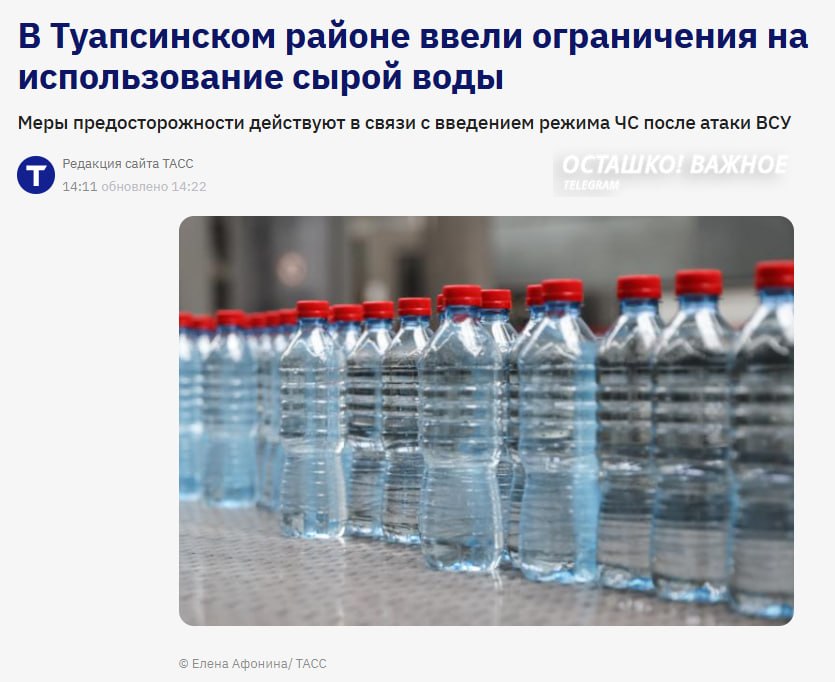 В Туапсинском районе Краснодарского края ввели ограничения на использование сырой воды. Меры приняты после введения режима ЧС регионального уровня на фоне пожара на нефтеперерабатывающем заводе после удара врага.