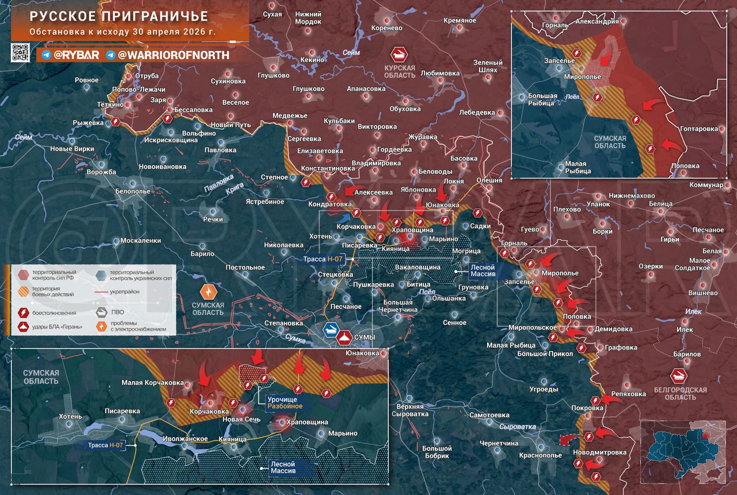 На Сумском направлении ВС РФ освободили населенный пункт Корчаковка на западном фланге. На восточном фланге удалось зачищено несколько крупных лесополос и оврагов к востоку от Мирополья, само село на половину находится под контролем российских штурмовиков.