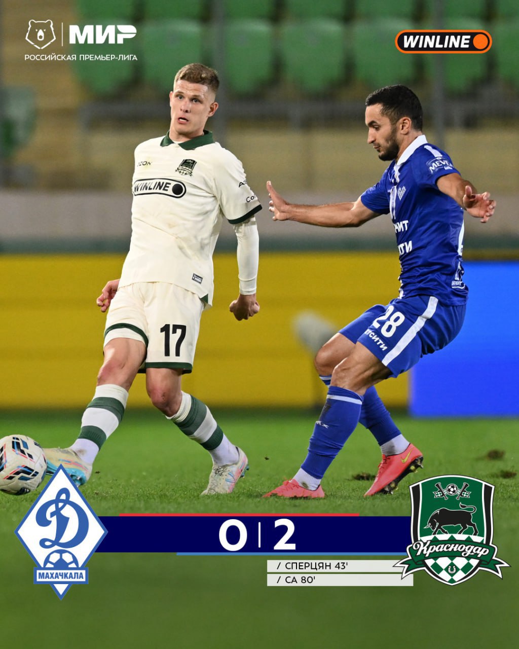 Футболисты «Краснодара» обыграли махачкалинское «Динамо» со счетом 2:0 в гостевом матче 12-го тура Российской премьер-лиги (РПЛ).