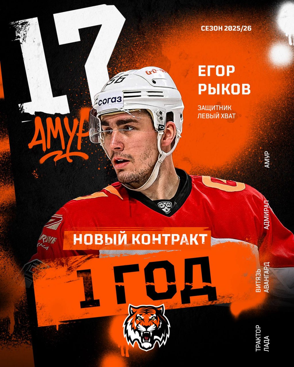 Защитник Егор Рыков продолжит карьеру в «Амуре». Об этом сообщила пресс-служба хабаровского клуба КХЛ.